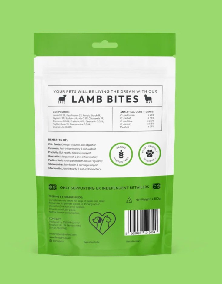 Lamb 90.2%, Pea Protein 2%, Potato Starch 1%, Glycerin 2%, Sodium chloride 0.5%, Chia seeds 3%, Curcumin 0.05%, Prebiotic 0.1%, Quercetin 0.05%, Psyllium husk 1%, Glucosamine 0.05%, Chondroitin 0.05%
